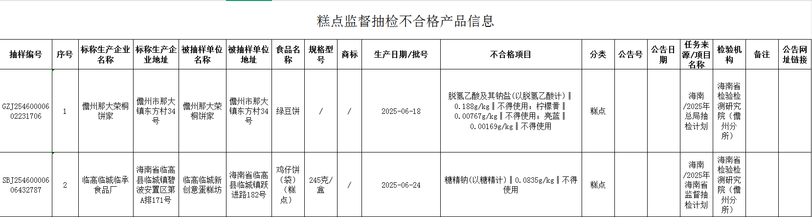 一、儋州那大荣桐饼家销售的绿豆饼,其中脱氢乙酸及其钠盐(以脱氢乙酸计)、柠檬黄、亮蓝等检验值不符合食品安全国家标准规定。