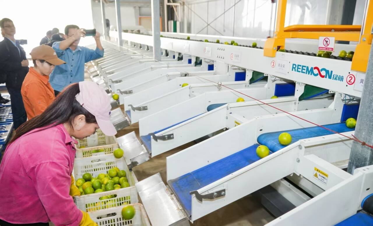 随即,在澄迈福山农产品分拣集散中心里,一条条自动化分选线正高速运转,每颗福橙都要经过红外线检测、糖酸度无损分级等“体检”,以实现精准分类,工人们正抓紧对“体检”后的福橙进行包装,将以最快的速度送到消费者手中。