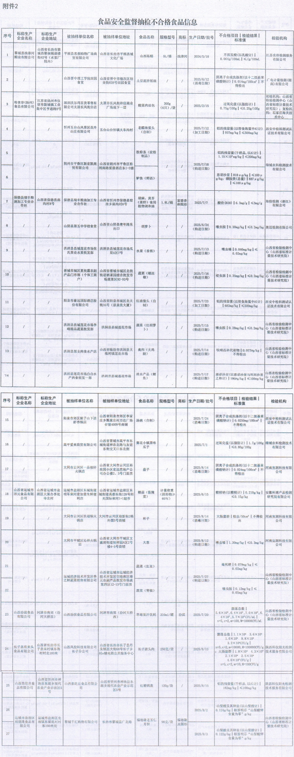 根据《中华人民共和国食品安全法》等法律法规要求及本省2025年度食品安全监督抽检工作实施方案和抽检细则,山西省市场监督管理局组织抽检餐饮食品、豆制品、糕点、罐头、酒类、粮食加工品、肉制品、食用农产品、方便食品、薯类和膨化食品、水果制品、调味品、速冻食品、水产制品、蔬菜制品、乳制品、饮料、糖果制品、饼干、蛋制品、保健食品、食糖、冷冻饮品、蜂产品、炒货食品及坚果制品、茶叶及相关制品、淀粉及淀粉制品和食用油、油脂及其制品等28大类,共1410批次。依据食品安全标准及国家有关规定进行检验和判定,合格1383批次,不合格27批次(抽检信息详见附件)。