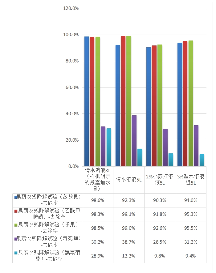 本次比较试验参照SB/T11190—2017、GB21551.2—2010为基础制定的《果蔬清洗机除菌试验方法》《果蔬农残降解评价方法》进行相关项目检测。