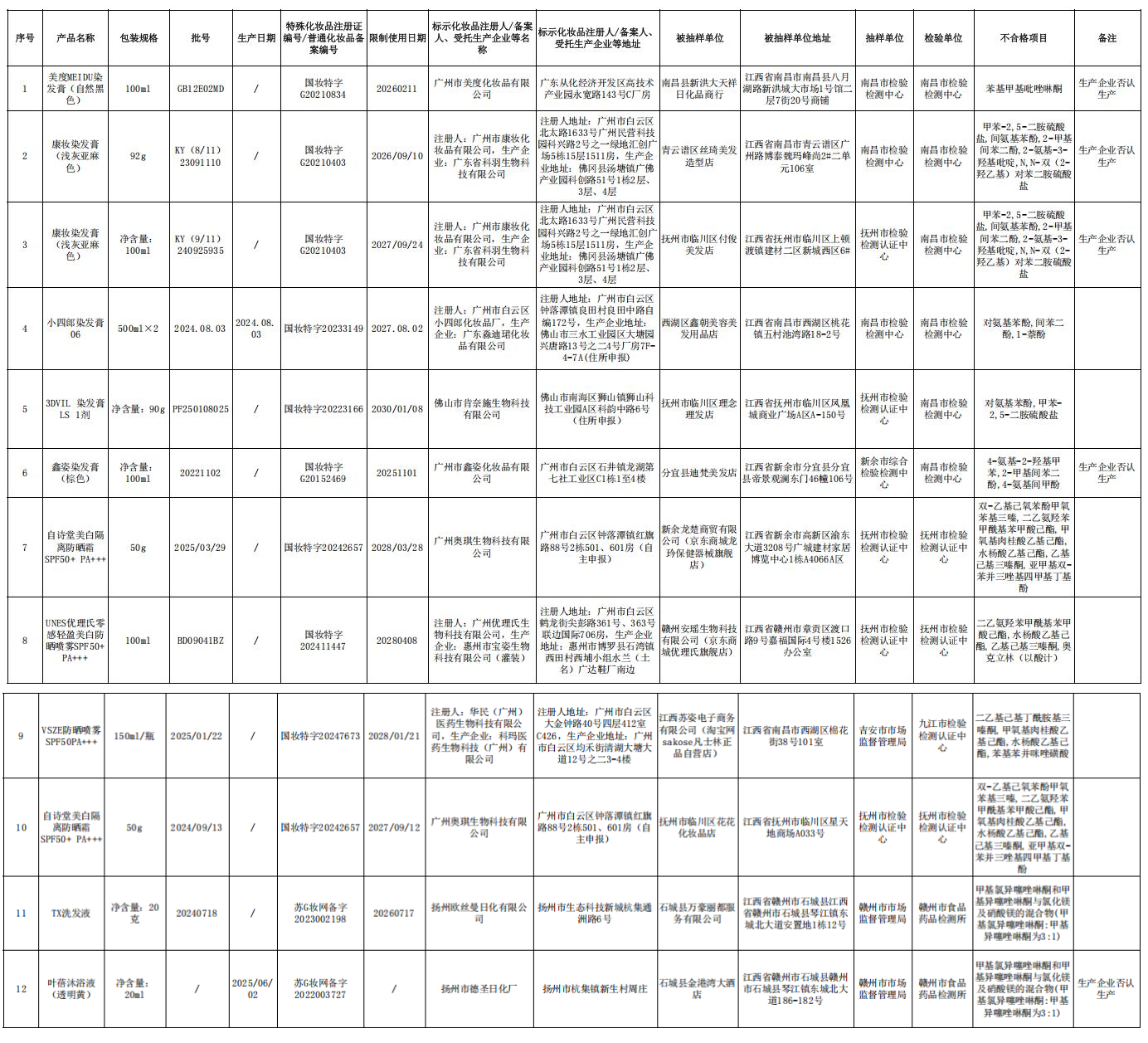为加强化妆品产品质量监督管理,保障化妆品产品使用安全有效,江西省药品监督管理局按照2025年全省化妆品监督抽检工作方案,持续对全省生产、流通环节化妆品实施监督抽检,本期对已核实的12批次不合格化妆品进行公告,具体抽检信息详见附件。