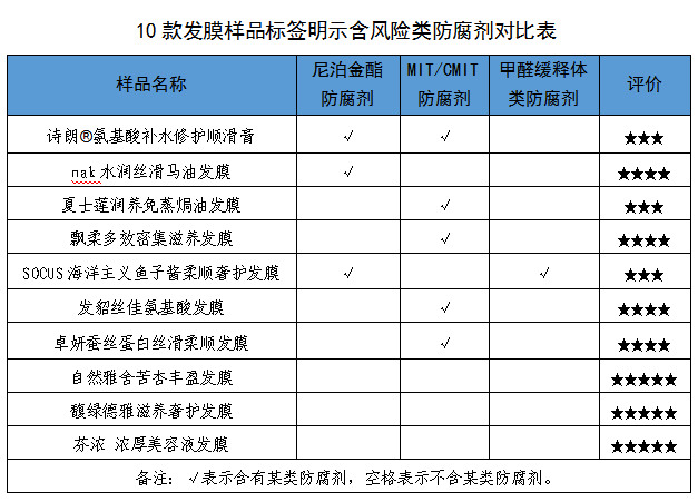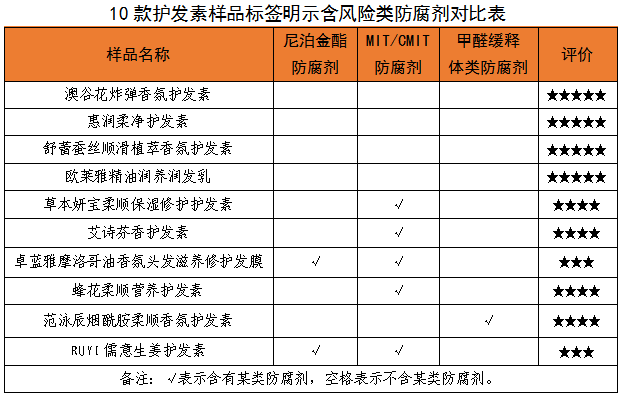成分对比是本次比较试验的亮点。在风险类防腐剂检测中,7款样品表现优异,未检出尼泊金酯、MIT/CMIT(卡松)、甲醛缓释体等致敏防腐剂,其中护发素样品包括澳谷、欧莱雅、惠润、舒蕾4款,发膜样品包括芬浓、自然雅舍、馥绿德雅3款。卓蓝雅护发素、诗朗发膜等样品则同时含有两类风险防腐剂,广西消委会特别提醒敏感肌消费者谨慎选择。