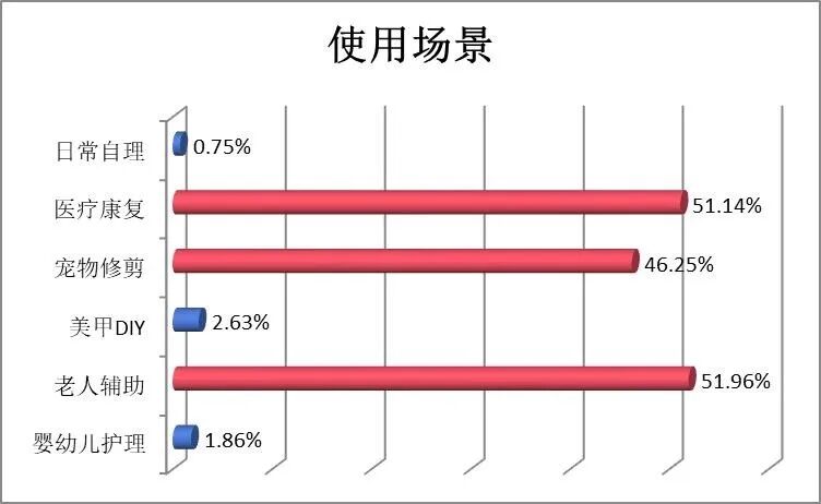 本次调查对象的年龄集中在18—45岁,占比99%,其中曾购买使用过电动指甲刀的人群占比94.18%。调查结果显示,消费者购买电动指甲刀最看重其安全性,安全设计以98%的占比成为消费者的核心关注点;高频使用是常态,主要使用场景包括老人辅助、宠物修剪及医疗康复;消费者最关注的三大功能依次为低噪声低震动、修剪效果和长续航。