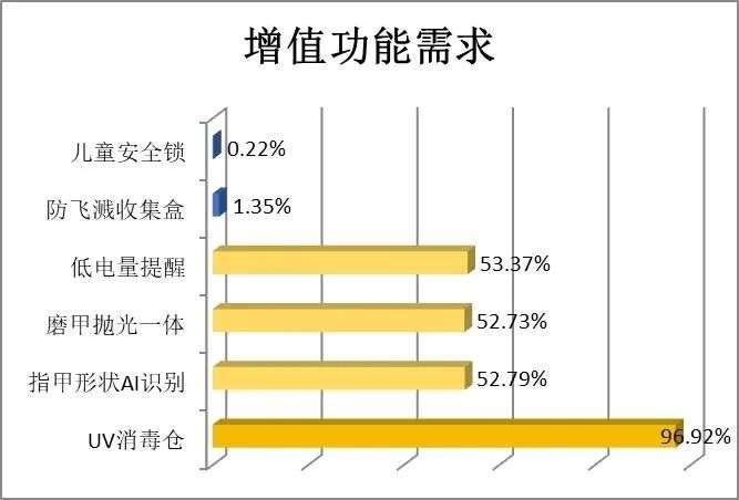 在使用痛点方面,调查结果显示,消费者对电动指甲刀的核心痛点集中在续航能力、刀头适配性(不同甲型)及智能感应灵敏度上。消费者认为电动指甲刀最需要提升的性能包括修剪精度(98%)、降噪减震、续航能力、防夹肉设计,这些需求比例均超过50%。在增值功能方面,UV消毒仓的需求达97%,指甲形状AI识别、磨甲抛光一体化、低电量提醒等功能的需求比例也超过50%。