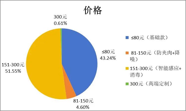 在选购方式、决策因素、价格方面,调查结果显示,多数消费者通过线下体验、社交媒体及网络博主推荐进行选购。在购买决策因素中,品牌是最主要的考量因素,其次是智能功能和噪音控制等。从价格分布来看,近99%的消费者选购价格集中在300元以下的基础款或“智能感应+消毒”款。