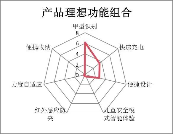 在理想功能上,甲型识别综合得分最高(6.16分),说明消费者希望产品能智能识别甲型、辅助修剪,其次是快速充电(3.49分)和便捷设计(2.77分),说明消费者对使用过程中的便捷性有一定需求。
