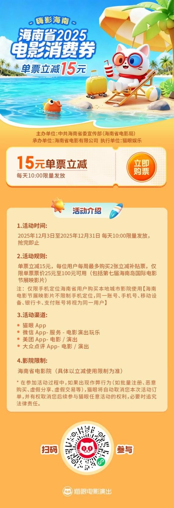 为便于用户参与,活动开通了多元购票渠道,用户可通过猫眼App、微信服务、美团App、大众点评App等平台参与活动,覆盖主流线上购票入口,操作便捷。优惠补贴仅限海南省范围内的电影院使用,福利数量有限,抢完即止。