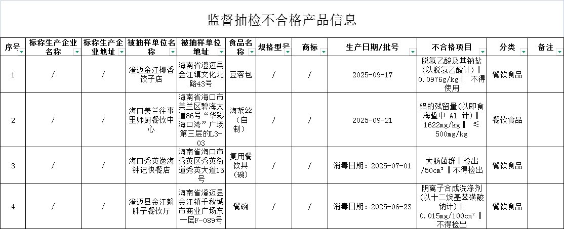 海南省市场监督管理局表示,对抽检发现的不合格产品,当地市场监管部门已开展核查处置。