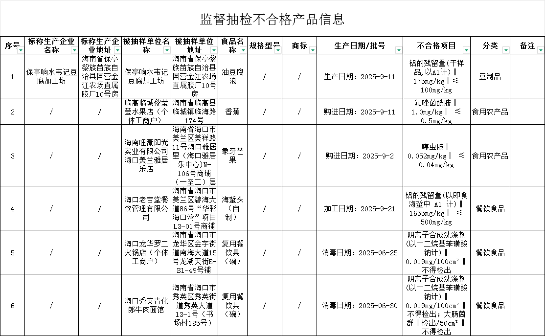 海南抽检发现6批次食品不合格