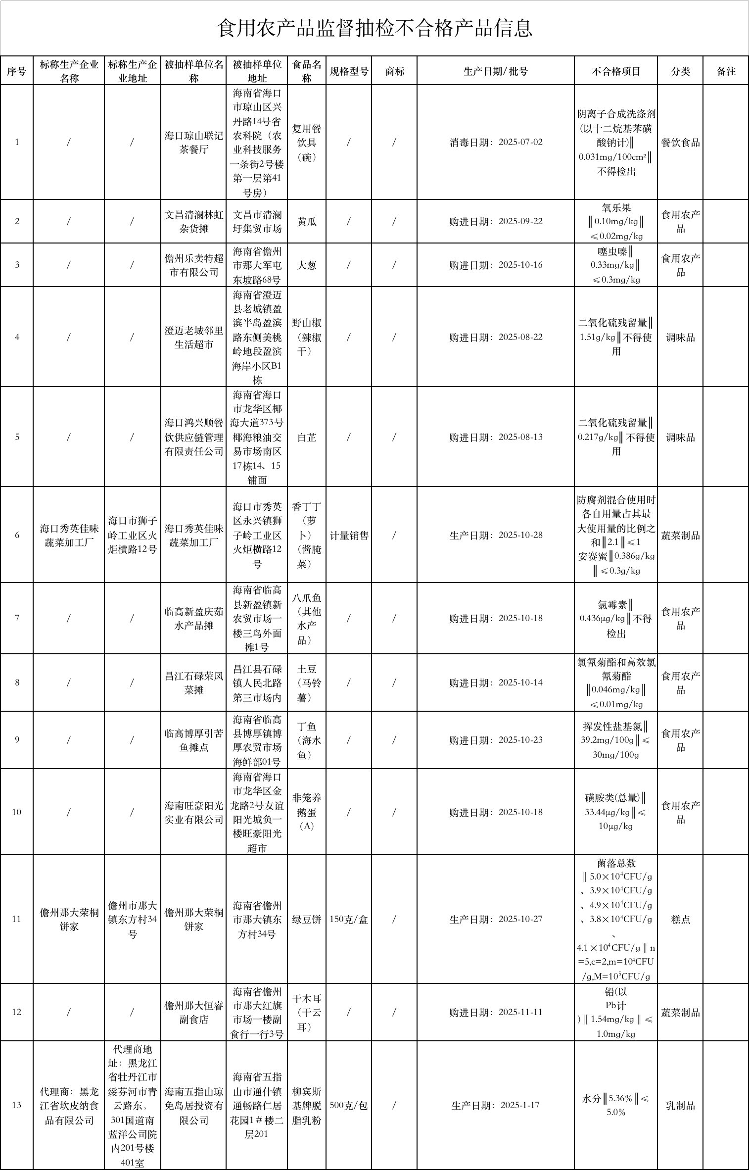据介绍,13批次不合格产品涉及农药残留超标、兽药残留超标、食品添加剂超范围超限量使用、重金属污染、质量指标不达标、微生物污染等问题。具体情况为: