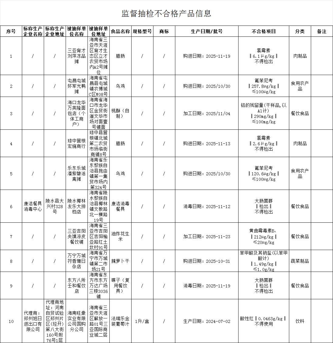海南抽检发现10批次产品不合格