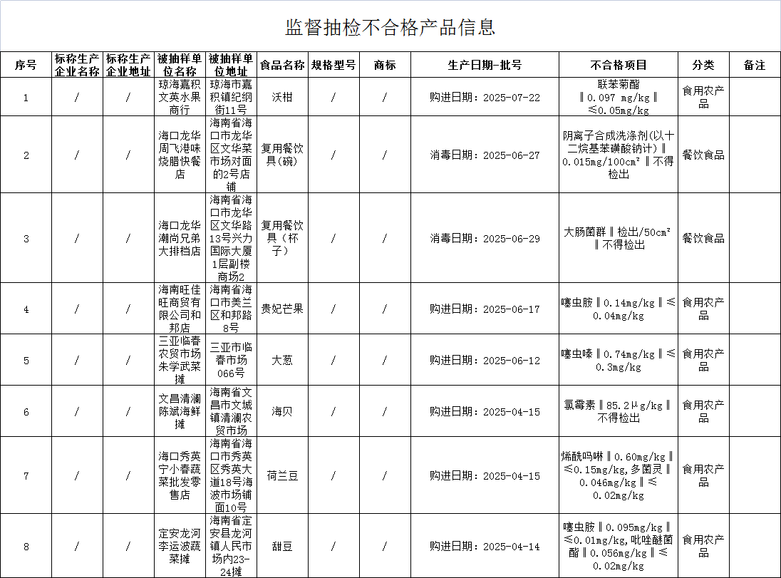 海南省市场监督管理局表示,对抽检发现的不合格产品,当地市场监管部门已开展核查处置。