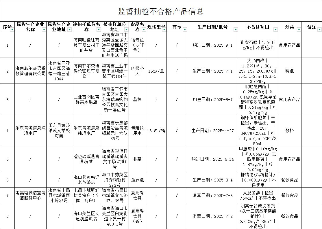 据悉,8批次不合格产品涉及农药残留超标、兽药残留超标、食品添加剂超范围超限量使用、微生物污染等问题。具体情况为: