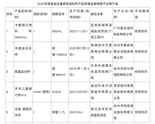 据悉,5批次不合格产品是卡维随行塑料杯(500mL)、手提运动水杯、圆盖运动杯、齐乐儿童随行杯410、北氪-极氪饮水杯等,分别由定安定城熙美诚品百货店(个体工商户)、海南琼中万家惠商贸有限公司、乐东乐城福乐佳百货购物广场、澄迈叶波大润发超市有限公司、海口龙华区祁如瑾百货店销售,分别由广州富全塑料制品有限公司、台州市黄岩柏朗生活用品有限公司、台州市龙仕翔塑胶有限公司、茶花现代家居用品股份有限公司、台州市凯拓塑业股份有限公司生产,涉及的不合格项目为标签标识。