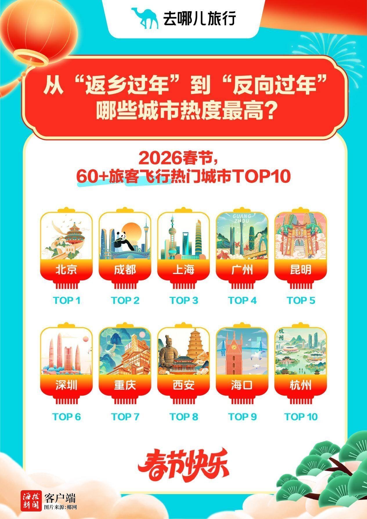 商报全媒体讯(椰网/海拔新闻记者 张艺)2026年春节假期最后一天,大部分人已经返程,结束这场被称为“史上最长”、横跨9天的“返乡+出游”假期;也有拼假族还在旅途中,打算把快乐延长,错峰再玩一程。去哪儿数据显示,2026春节期间反向飞往北上广深一线城市的旅客中,18%为50岁以上人群,其中60岁及以上旅客同比增长超一成;反向过年进一步带旺大城市的春节旅游市场,60岁以上老人酒店入住量同比增长56%。