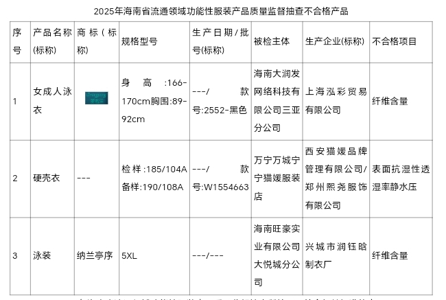 3批次不合格产品是女成人泳衣、硬壳衣、纳兰亭序泳装,分别由海南大润发网络科技有限公司三亚分公司、万宁万城宁宁猫媛服装店、海南旺豪实业有限公司大悦城分公司销售,分别由上海泓彩贸易有限公司、西安猫媛品牌管理有限公司/郑州熙尧服饰有限公司、兴城市润钰晗制衣厂生产,涉及的不合格项目为纤维含量、表面抗湿性、透湿率、静水压等。