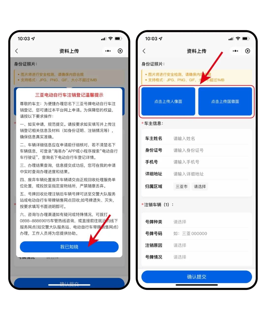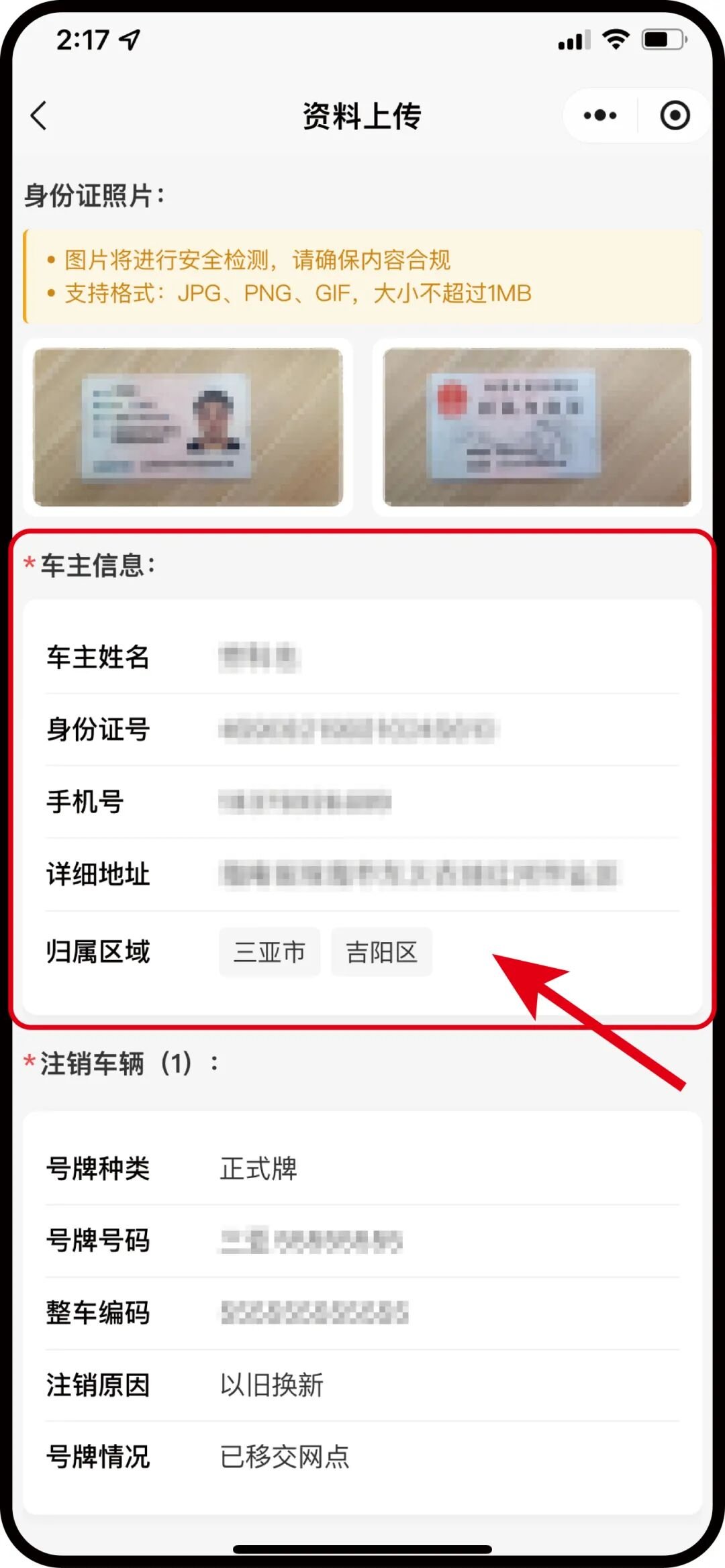 2.根据页面要求上传个人身份证正反面照片,填写车主信息及注销车辆信息,全都填写完成后点击“确认提交”提交申请。