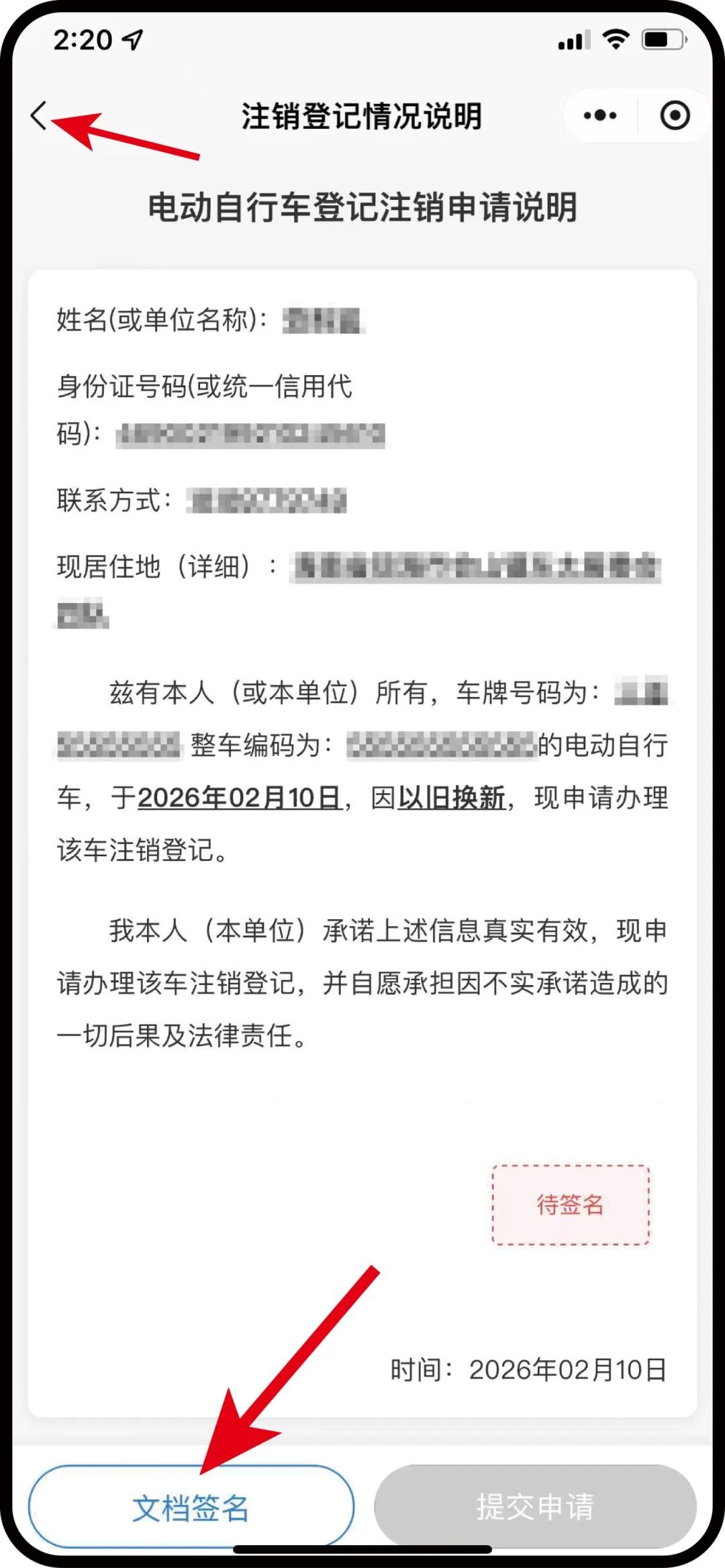2.人脸识别通过后,核对注销申请信息,如果信息不正确就点击左上角的返回图标“<”,重新填写,确认信息无误后点击左下角“文档签名”。