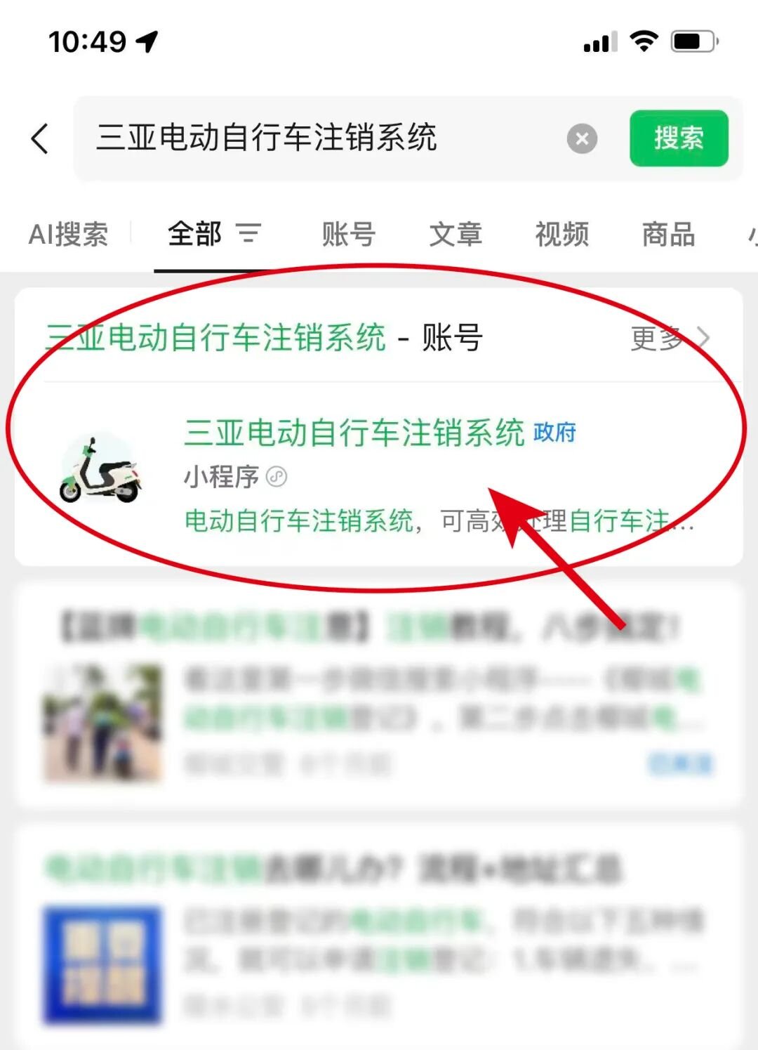 1.打开微信,从右上角搜索图标打开搜索框,输入“三亚电动自行车注销系统”,点击进入官方小程序。