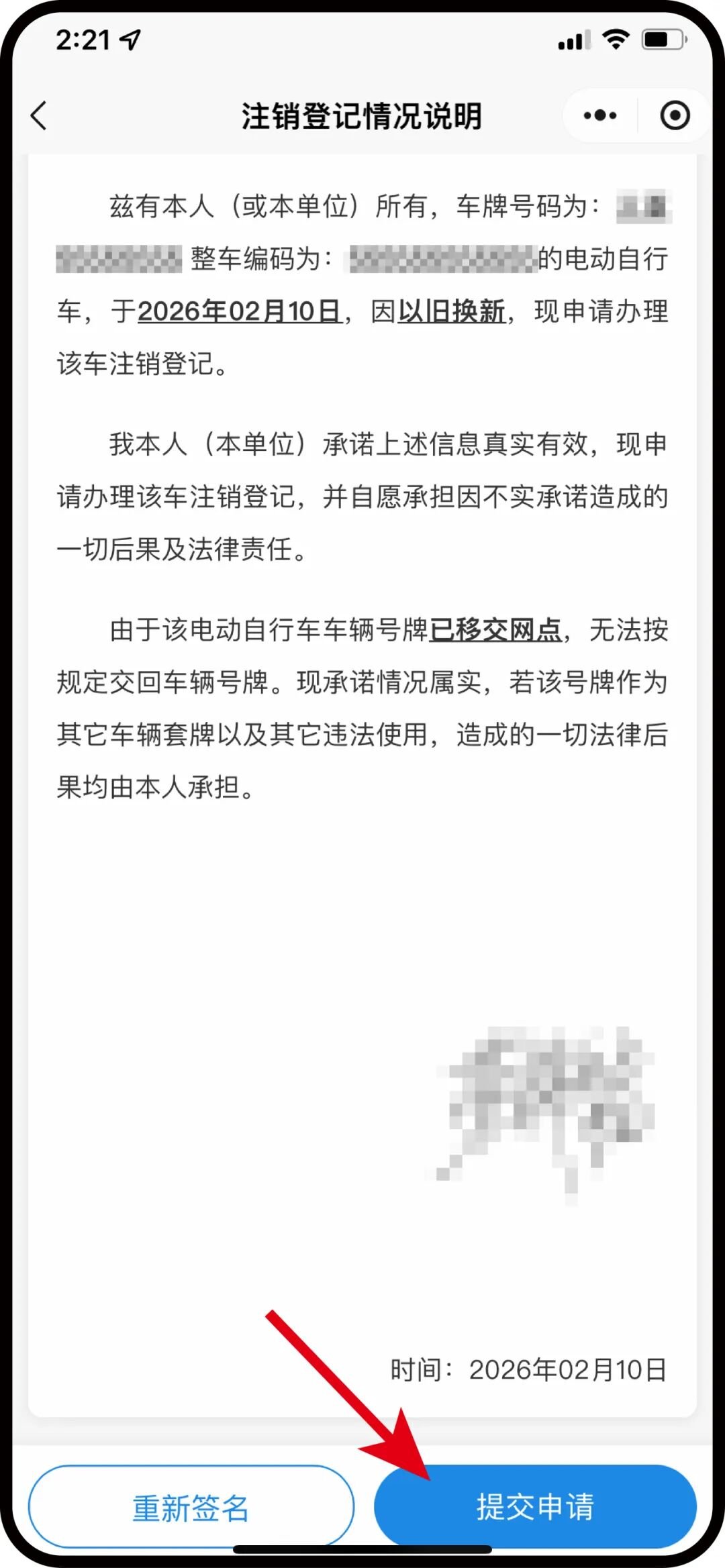 3.手写签名后点击“完成”,页面跳转到提交申请页,请再次核对注销申请信息是否正确,如果不正确,可点击修改,如果正确则点击“提交申请”,完成注销申请流程,等待审核处理。