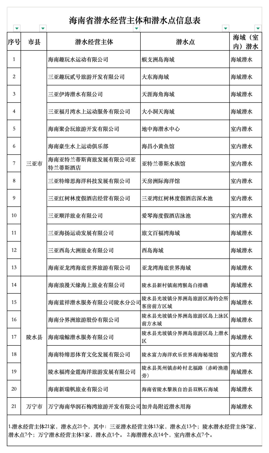 商报全媒体讯(椰网/海拔新闻记者 张艺)近日,海南省旅游和文化广电体育厅公布海南省潜水经营主体和潜水点信息表,共计21家潜水经营主体、21个潜水点位纳入名单。