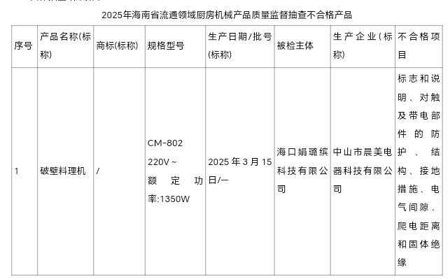 据悉,1批次不合格产品是由海口娟璐缤科技有限公司销售、中山市晨美电器科技有限公司生产的破壁料理机,涉及的不合格项目为标志和说明、对触及带电部件的防护、结构、接地措施、电气间隙、爬电距离和固体绝缘。