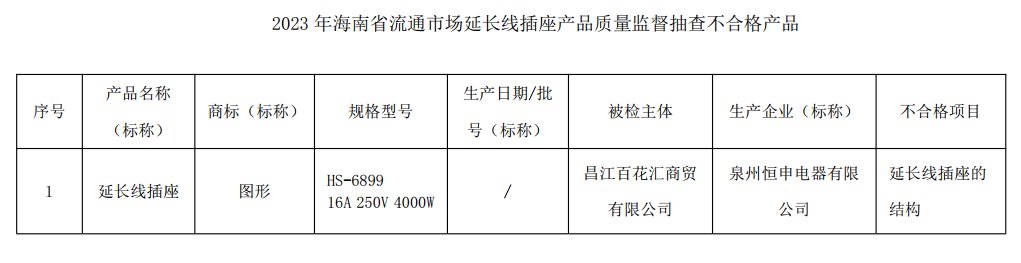 对全省流通市场延长线插座产品进行监督抽查,抽查17批次产品,经检验,不合格1批次,不合格率为5.9%。1批次不合格延长线插座由昌江百花汇商贸有限公司销售、泉州恒申电器有限公司生产。不合格项目为延长线插座的结构,延长线插座的结构不符合标准要求会导致产品在结构上存在缺陷,轻则影响正常使用,重则引起用电安全。