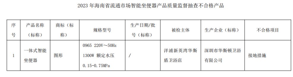 对全省流通市场智能坐便器产品进行监督抽查,抽查12批次产品,经检验,不合格1批次,不合格率为8.3%。1批次不合格产品是一体式智能坐便器,由洋浦新英湾华斯盾卫浴店销售、深圳市华斯顿卫浴有限公司生产。不合格项目为接地措施,当电源线意外地从固定装置滑出时,接地导线在载流导线之前先绷紧,会造成消费者使用过程中发生触电危险。