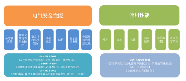 本次比较试验主要依据国家标准,委托第三方检测机构对空气循环扇的电气安全性能、使用性能进行检测。检测项目及依据见图2。
