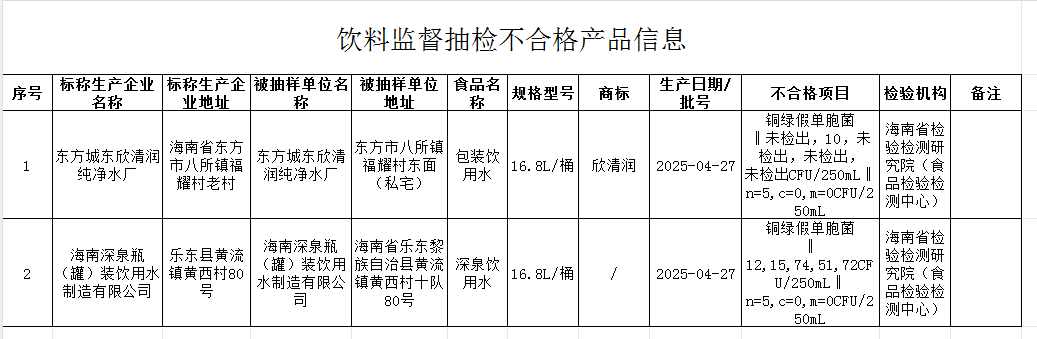 海南省市场监督管理局表示,对抽检发现的不合格食品,当地市场监管部门已开展核查处置。