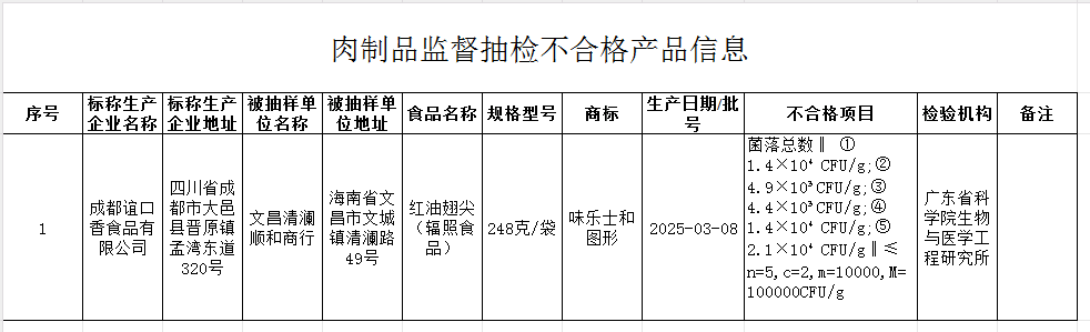 十二、文昌清澜顺和商行销售的,标称成都谊口香食品有限公司生产的红油翅尖(辐照食品),其中菌落总数不符合食品安全国家标准规定。