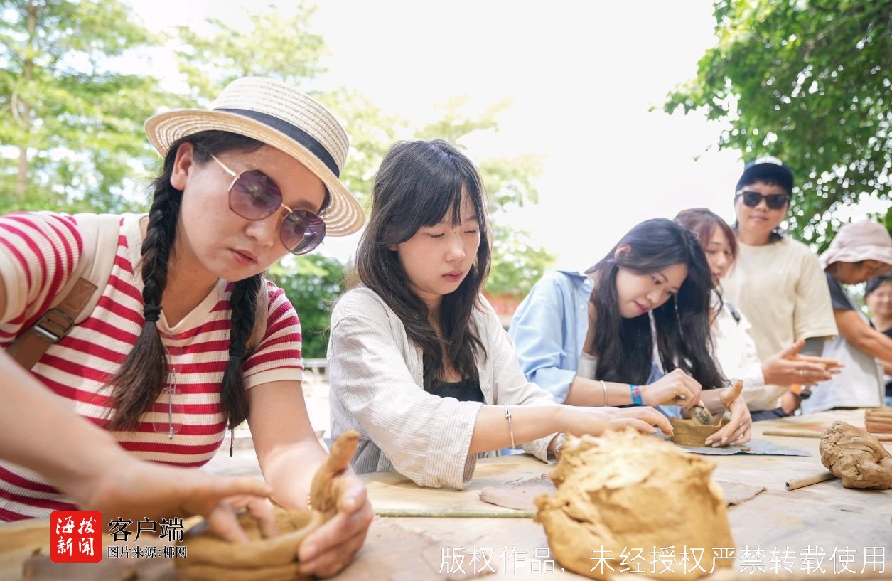 “黎族制陶不靠转轮,全凭双手盘筑,泥条要匀,力道要稳。”工坊经理李名众介绍,黎族原始制陶技艺于2006年被列入第一批国家级非物质文化遗产名录,是海南文化瑰宝的重要组成部分。“泥条盘筑法”制陶工艺是最古老的制陶方法之一,已流传千年。听罢采风团成员纷纷跃跃欲试,有人的陶坯刚立起就塌了腰,有人的泥条歪歪扭扭像“麻花”,众人在嬉笑中感受黎陶的文化魅力。
