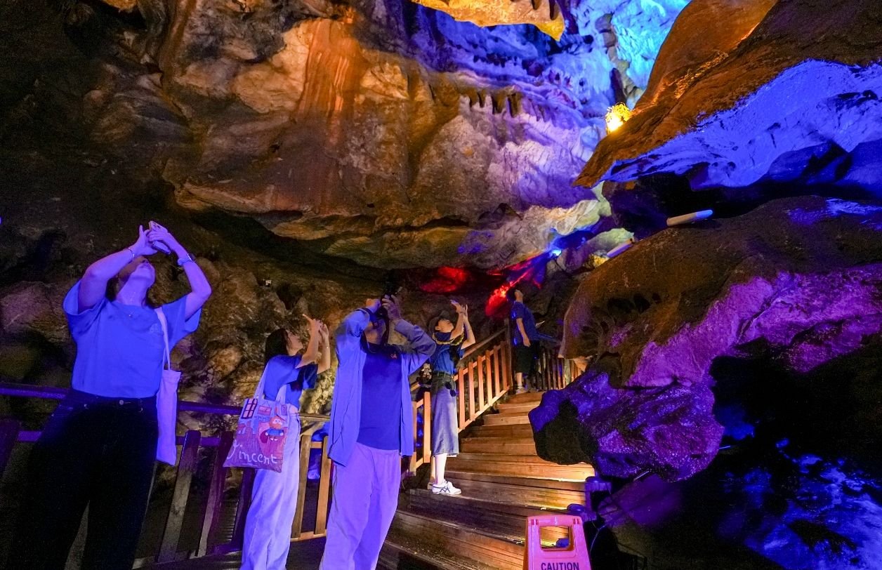洞外湖上泛舟,被誉为“东方小桂林”的湖光山色让采风团瞬间“入画”。湖水碧绿如翡翠,两岸奇峰罗列,游船缓缓行驶在碧波上,仿佛置身一幅巨大的立体山水画,让人流连忘返。