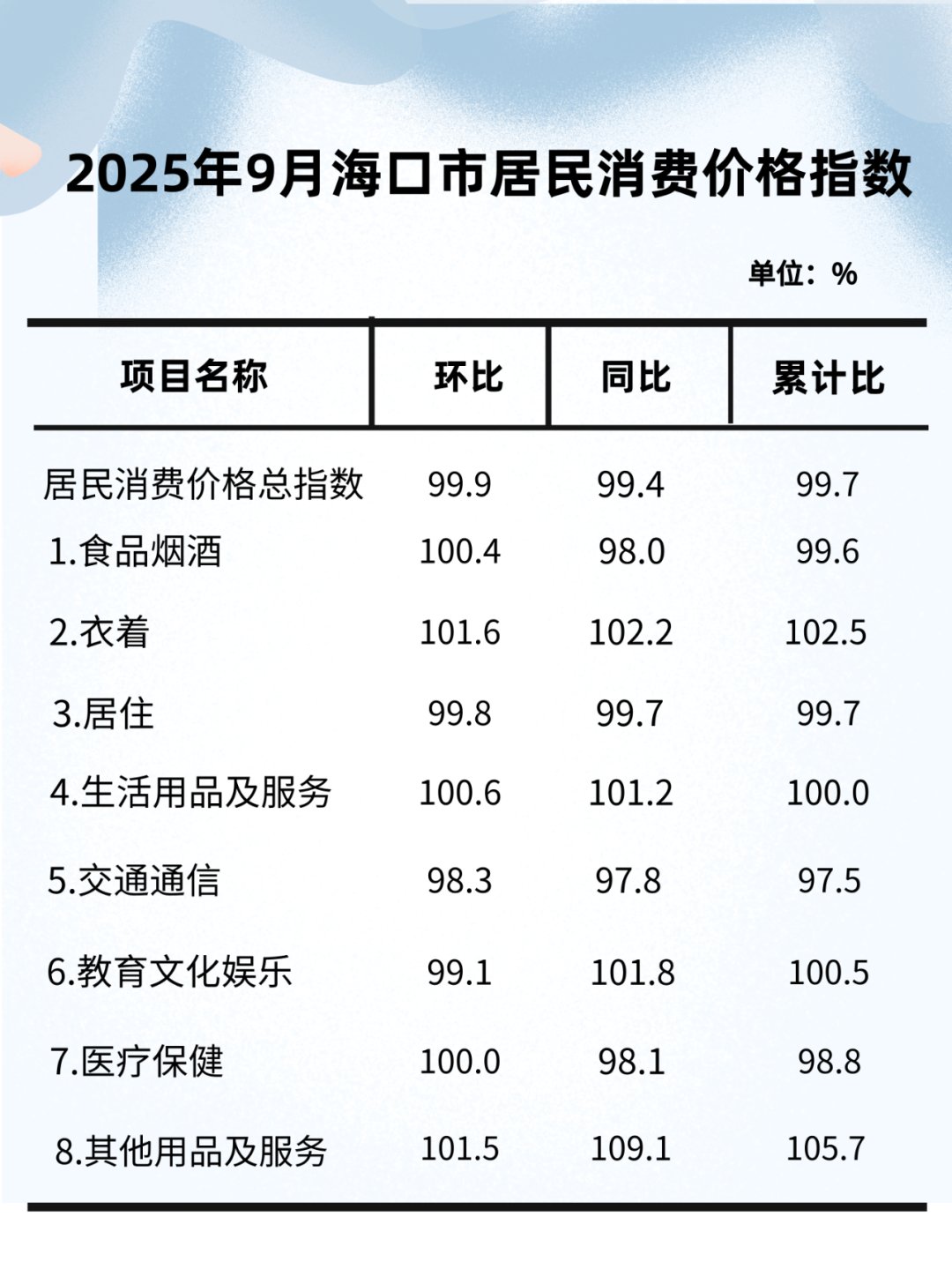 (原标题:【数据发布】2025年9月份海口市居民消费价格指数)