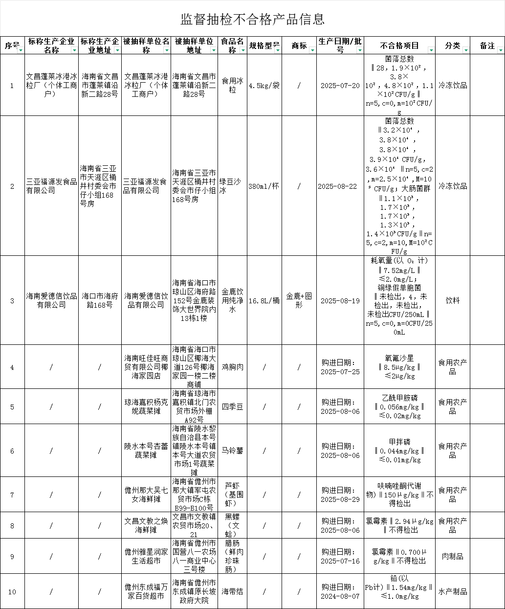 海南省市场监督管理局表示,对抽检发现的不合格产品,当地市场监管部门已开展核查处置。