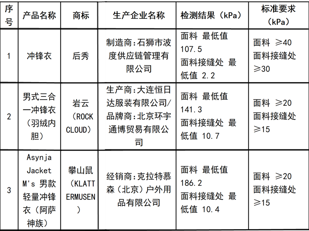 在标称执行新国标的19款样品里,3款未明示级别,按Ⅰ级指标考核后,标称为后秀品牌的冲锋衣面料接缝处静水压值未达到标准要求;15款标称执行Ⅱ级指标的产品中,标称为岩云(ROCK CLOUD)、攀山鼠(KLATTERMUSEN)品牌的冲锋衣面料接缝处洗后静水压值未达到标准要求。