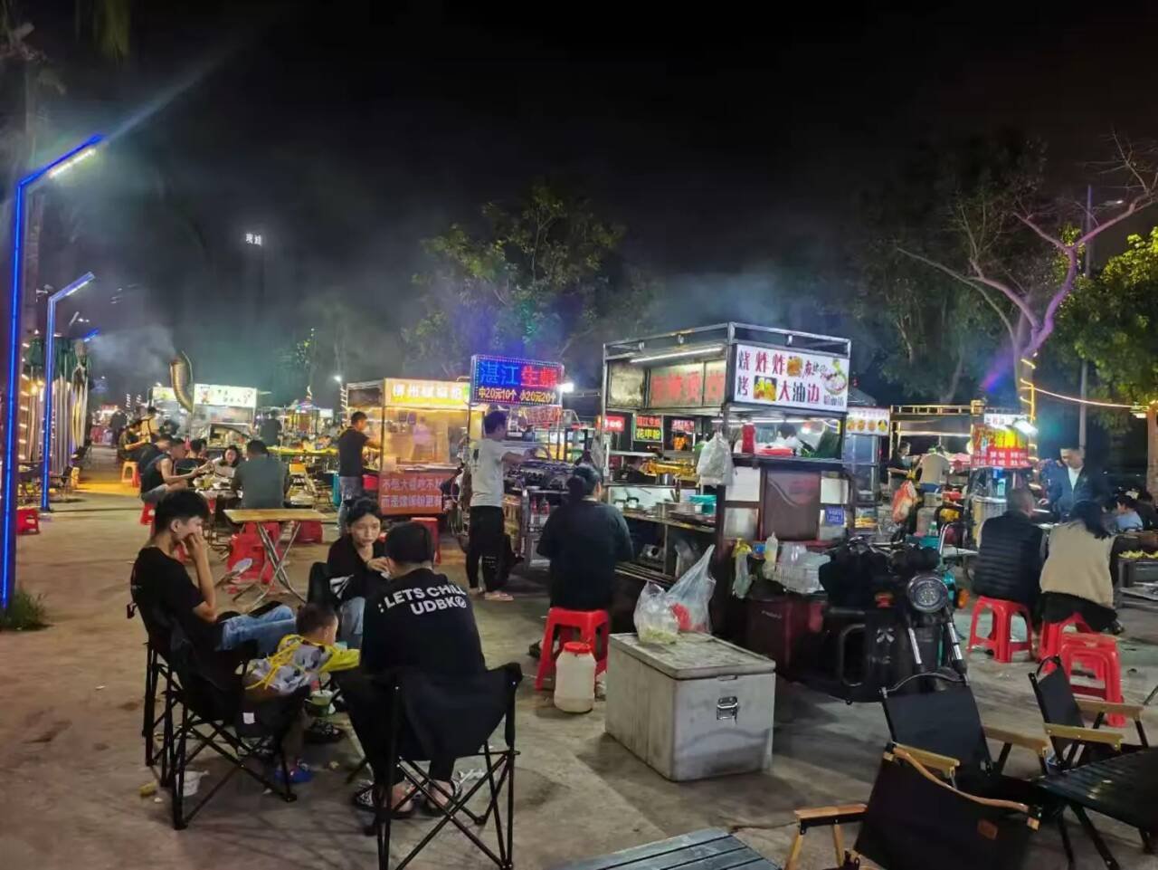 为破解这一乱象,海口市秀英区海秀镇指导水头村盘活闲置空地,打造了占地约4亩、设有约100个固定摊位的水头便民夜市,通过降租、免租等优惠条件吸引流动摊贩进驻夜市,并安排专门的保洁、安保人员负责环境卫生和市场秩序的维护。夜幕降临,水头夜市灯火通明,烧烤、水果、冷饮、特色小吃等多元业态汇聚浓浓烟火气,不仅满足了周边居民和外来租户的夜间消费需求,更成为提升城镇活力与吸引力的新名片。据统计,水头村夜市已吸纳78家流动摊贩入市规范经营,解决了100多人的就业问题。
