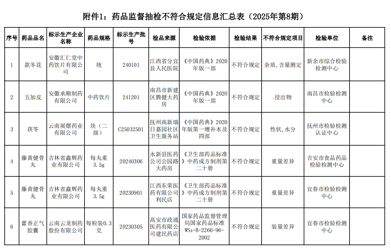 附件:1.药品监督抽检不符合规定信息汇总表(2025年第8期)