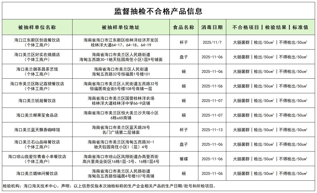 不合格复用餐具涉及海口江东新区创造餐饮店(个体工商户)、海口美兰区好实在烧腊店(个体工商户)、海口美兰御茶昌茶艺馆(个体工商户)、海口市美兰区陈记荔银餐饮店(个体工商户)、海口美兰锐越餐饮店、海口美兰椰果笙食品店、海口美兰蓝天飘香咖啡馆、海口美兰石山品味餐饮店(个体工商户)、海口琼山我爱你青春小串餐饮店(个体工商户)、海口美兰璐钵问餐饮店等10家餐饮店。