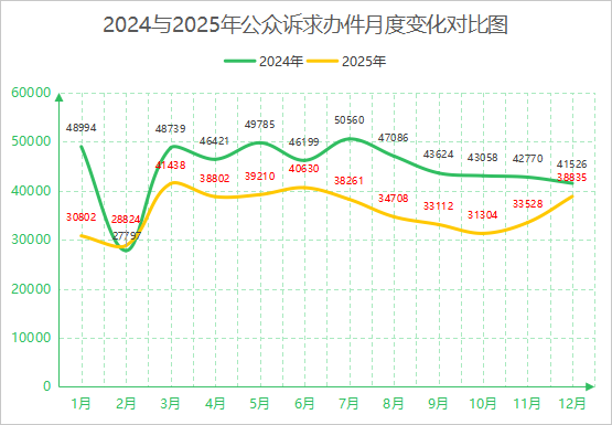 根据数据统计,2025年各月投诉举报量除了2月增长3.7%,其余月份均显著低于2024年同期,降幅在6%至37%之间。其中1月降幅最大,达37%,2月是年度最低值(28824件)。