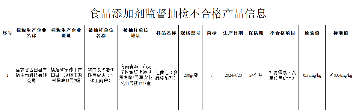 二、江苏华中生物科技[经营者为海南省海口龙华浩优联百货店(个体工商户)]在淘宝网(网店)销售的、标称福建省古田县丰驰生物科技有限公司生产的红曲红(食品添加剂),其中桔青霉素(以单位色价计)检验值不符合食品安全国家标准规定。