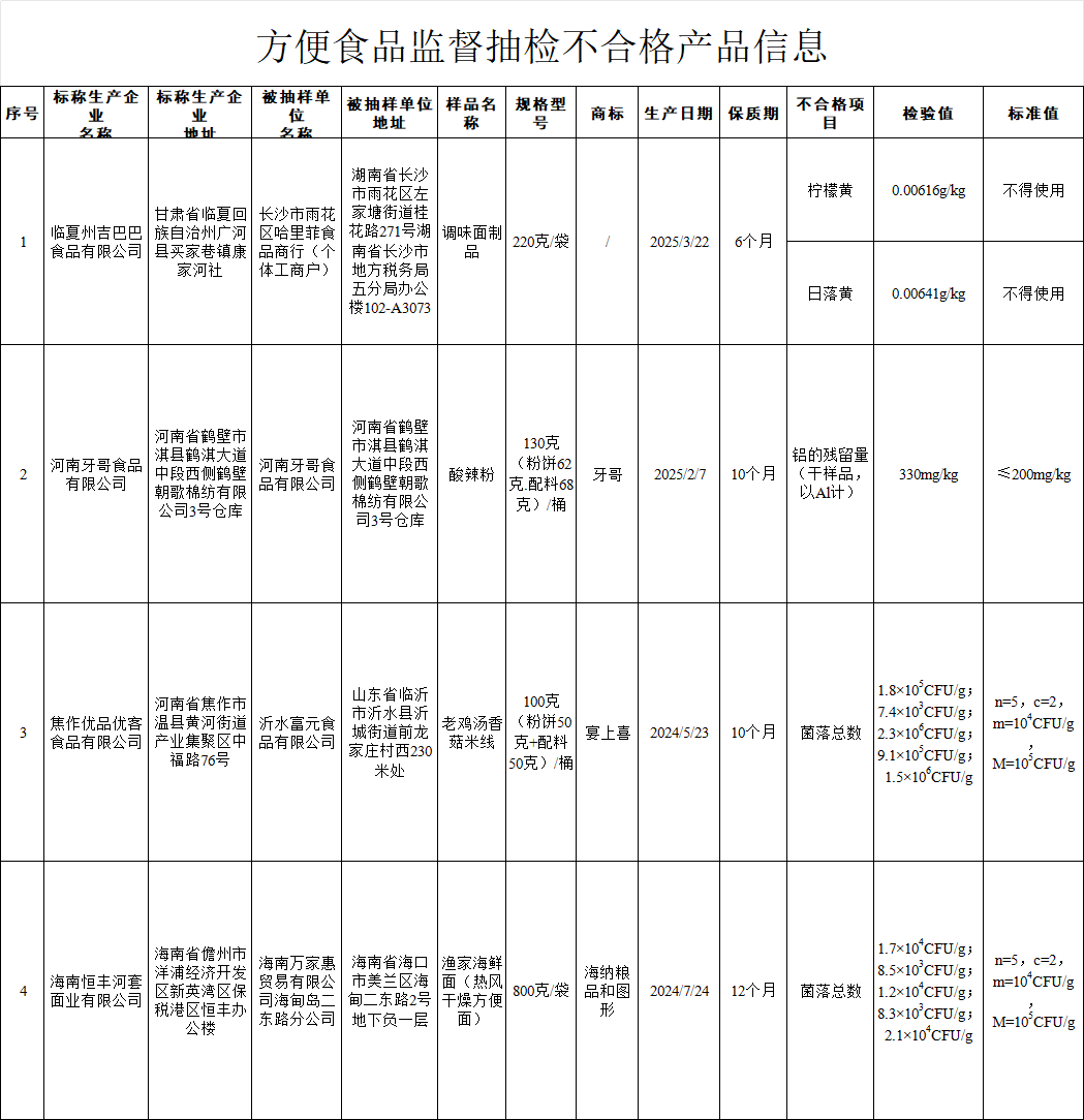 一、海南万家惠贸易有限公司海甸岛二东路分公司销售的、标称海南恒丰河套面业有限公司生产的渔家海鲜面(热风干燥方便面),其中菌落总数不符合食品安全国家标准规定。