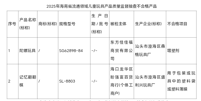 据悉,2批次不合格产品是陀螺玩具、记忆翻翻棋,分别由东方佳佳福商贸有限公司、海口龙华区盼强富百货商行(个体工商户)销售,分别由汕头市澄海区森格玩具厂、汕头市澄海区盛利兴玩具厂生产,涉及的不合格项目为:用于包装或玩具中的塑料袋或塑料薄膜、增塑剂。