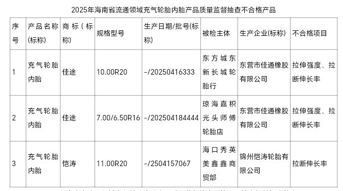 海南省市场监督管理局表示,抽查发现的不合格充气轮胎内胎产品将移交被检主体及产品标称的生产企业所在地市场监管部门依法进行处理。