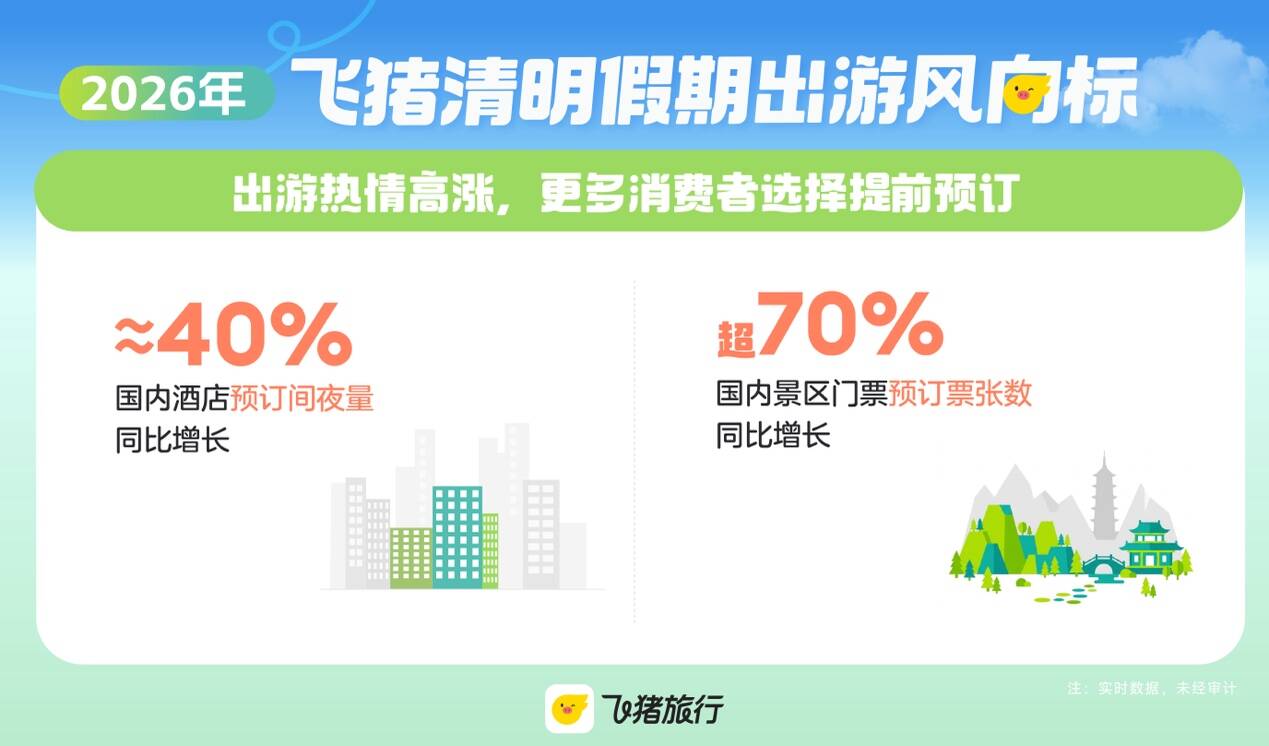 商报全媒体讯(椰网/海拔新闻记者 张艺)临近清明假期,旅游预订迎来春季高峰。3月26日,飞猪发布《2026清明假期出游风向标》。数据显示,截至目前飞猪清明假期旅游预订量较去年同期强劲增长。其中,国内酒店预订间夜量同比增长约40%,国内景区门票的预订票张数同比增长超70%。